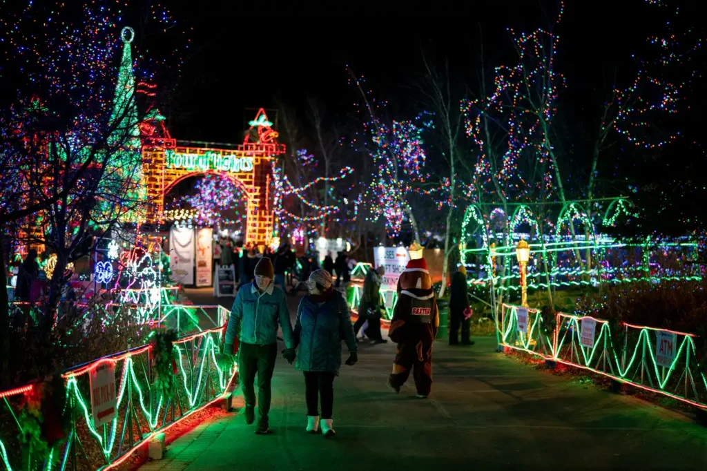 Bentleyville Tour of Lights is a free walk-through holiday lighting extravaganza at Bayfront Festival Park in Duluth, Minnesota. Open nightly from November 22 to December 27, 2025, the display features over 5 million lights and offers free admission along with complimentary hot cocoa, coffee, cookies, popcorn, and marshmallows. The event runs 5:00 pm–9:00 pm Sunday–Thursday and 5:00 pm–10:00 pm Friday and Saturday. Visitors can enjoy visits with Santa and Mrs. Claus, special events, and a 128-foot-tall LED tree while strolling through the park. Parking is available on site (fees apply).